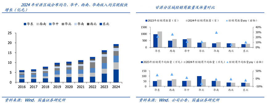 經(jīng)典案例:根據(jù)wind、公司公告、國盛證券研究所等綜合資訊表明,甘源公司線下經(jīng)銷團(tuán)隊(duì)擴(kuò)容,推動(dòng)營收高增長。從區(qū)域來看,2024 年公司華東/西南/華中/華北/ 華南/西北/東北分別實(shí)現(xiàn)收入 6.6/3.7/3.4/2.3/1.6/1.0/0.7 億元,2020-2024 年 CAGR 分 別為 24.2%/21.9%/12.2%/18.5%/14.0%/1.3%/0.6%。