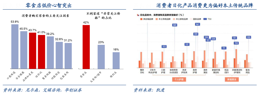 經(jīng)典案例:根據(jù)尼爾森、艾媒咨詢、凱度、華創(chuàng)證券等綜合資訊表明,零食店低價心智突出,而消費者日化產(chǎn)品消費更為偏好本土傳統(tǒng)品牌。