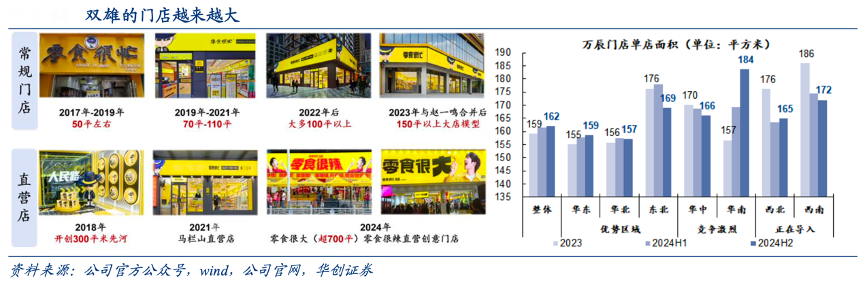 經(jīng)典案例:根據(jù)公司官方公眾號、wind、公司官網(wǎng)、華創(chuàng)證券等綜合資訊表明,隨著行業(yè)競爭核心從“拼手速”到“拼效率”,頭部企業(yè)持續(xù)擴大門店面積,標(biāo)準(zhǔn)化門店面積從早先的 50 平、70-100 平、100-120 平,至當(dāng) 前新開門店普遍要求 150 平甚至 180 平以上,提升消費者“逛”的購物體驗。