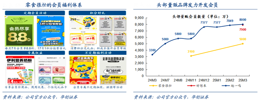 經(jīng)典案例:根據(jù)公司官方公眾號(hào)、華創(chuàng)證券等綜合資訊表明,2023 年左右零食很忙、好想來(lái)均開(kāi)拓會(huì)員體系,配套以各類會(huì)員活動(dòng)及福利,開(kāi)拓客群并強(qiáng) 化會(huì)員粘性,頭部企業(yè)會(huì)員數(shù)快速攀升,且鳴鳴很忙 1.2 億個(gè)、好想來(lái) 7900 萬(wàn)個(gè)會(huì)員, 大幅領(lǐng)先中小品牌不足 2000 萬(wàn)會(huì)員的水平。此外,量販品牌逐步開(kāi)拓開(kāi)辟直播、線上商 城/外賣、團(tuán)購(gòu)等業(yè)務(wù),試水拓寬業(yè)務(wù)邊界。