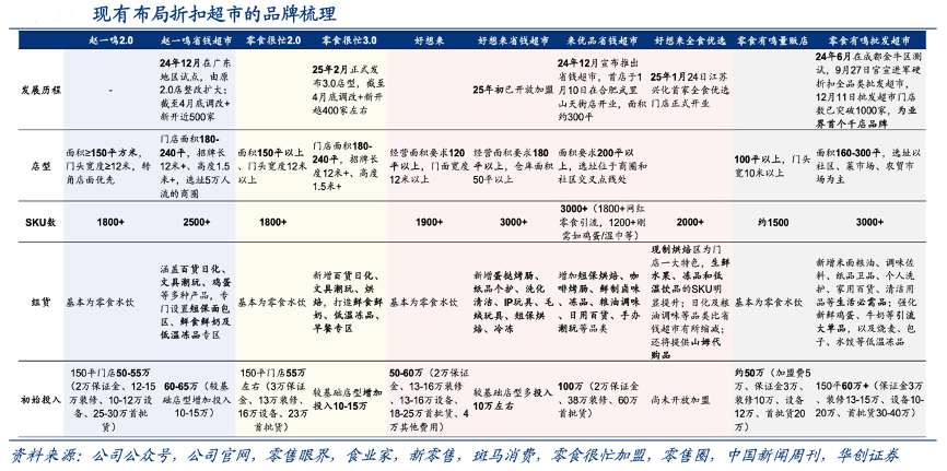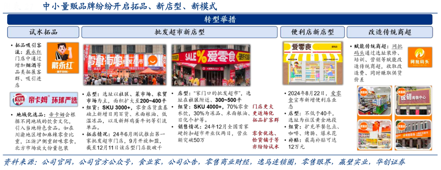經(jīng)典案例:根據(jù)公司官網(wǎng)、公司官方公眾號(hào)、食業(yè)家、公司公告、零售商業(yè)財(cái)經(jīng)、逸馬連鎖圈、零售眼界、贏壁實(shí)業(yè)、華創(chuàng)證券等綜合資訊表明,中小量販品牌紛紛開(kāi)啟拓品、新店型、新模式。