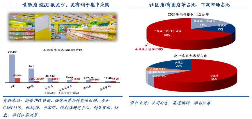 經(jīng)典案例:根據(jù)尚普IPO咨詢、快速消費(fèi)品精英俱樂(lè)部、參加CANPLUS、私域榜、中零院、便利店研究中心、鈞策咨詢、36氪、公司公告、渠道調(diào)研、華創(chuàng)證券等綜合資訊表明,從近兩年實(shí)際運(yùn)營(yíng)來(lái)看,量販行業(yè)擴(kuò)張?jiān)鏊倏煊陬A(yù)期,門店數(shù)量由 2021 年的 2500 家左右快速擴(kuò)張至 2024 年底的超過(guò)4 萬(wàn)家,且從行業(yè)龍頭鳴鳴很忙門店分布看,縣城及鄉(xiāng)鎮(zhèn)門店占比達(dá) 58%,下沉市場(chǎng)占據(jù) 主體。