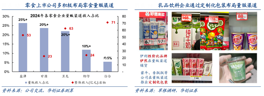 經(jīng)典案例:根據(jù)公司交流、草根調(diào)研、華創(chuàng)證券等綜合資訊表明,零食量販企業(yè)順應(yīng)趨勢(shì)、陸續(xù)加碼,并通過(guò)協(xié)調(diào)定價(jià)、聯(lián)名、定制化包裝等降低對(duì)價(jià)盤的擾動(dòng),如蒙牛、香飄飄與零食很忙聯(lián)合生產(chǎn)“XXXL 型”產(chǎn)品,以及定制化生產(chǎn)小包裝產(chǎn)品在量販渠道鋪貨。