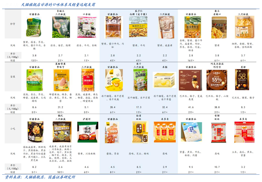 經(jīng)典案例:根據(jù)天貓旗艦店、國(guó)盛證券研究所等綜合資訊表明,甘源在老三樣領(lǐng)域已形成顯著品牌優(yōu)勢(shì),從產(chǎn)品風(fēng)味體系來(lái)看,甘源已覆蓋蟹黃、醬汁、肉松、蒜香、芥末、烤肉等風(fēng)味體系,其他品牌更多為跟隨;從價(jià)格體系角度來(lái)看,即使甘源單克售價(jià)更高,但銷量依然斷層領(lǐng)先其他品牌,順利實(shí)現(xiàn)品牌溢價(jià)。
