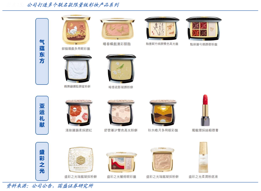 經(jīng)典案例:根據(jù)公司公告、國盛證券研究所等綜合資訊表明,MGP 品牌在彩妝條線推出限量版產(chǎn)品,融入傳統(tǒng)文化及先進技術(shù)以提升使用體驗和妝效,推出的代表性限量版 產(chǎn)品包括氣蘊東方系列(與故宮文創(chuàng)聯(lián)手打造,融合故宮博物館的百年傳承和傳統(tǒng)東方 美學(xué)元素,目前已升級至第五代)、亞運禮獻系列(結(jié)合杭州美景和亞運元素)等。