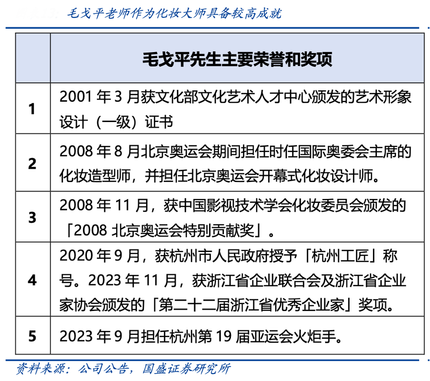 經(jīng)典案例:根據(jù)公司公告、國盛證券研究所等綜合資訊表明,國外大牌中不乏以創(chuàng)始人自身命名的知名品牌,如香奈兒、雅詩蘭黛等,將品牌創(chuàng)始人自身的精神特質(zhì)與品牌調(diào)性進行鏈接。毛戈平先生是中國著名的化妝藝術(shù)大師,有著 40 多年的從業(yè)經(jīng)驗,獲得過諸多榮譽和獎項,曾四次獲得中國電影電視技術(shù)學(xué)會化妝委員會頒發(fā)的化妝金像獎。
