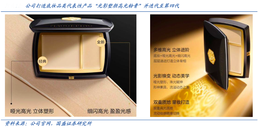 經(jīng)典案例:根據(jù)公司官網(wǎng)、國盛證券研究所等綜合資訊表明,毛戈平截至 2024 年 末,MGP 品牌的產(chǎn)品組合包含 400 多個(gè)單品,其彩妝產(chǎn)品系列包含 粉底、高光和陰影、眼妝、唇妝等品類,專為中國消費(fèi)者獨(dú)特的膚質(zhì)、面部結(jié)構(gòu)和 審美偏好打造。其中代表性產(chǎn)品光影塑顏高光粉膏已上市逾十年,歷經(jīng)廣泛的市場 測試,目前已迭代至第四代,可呈現(xiàn)自然亮白和立體五官。